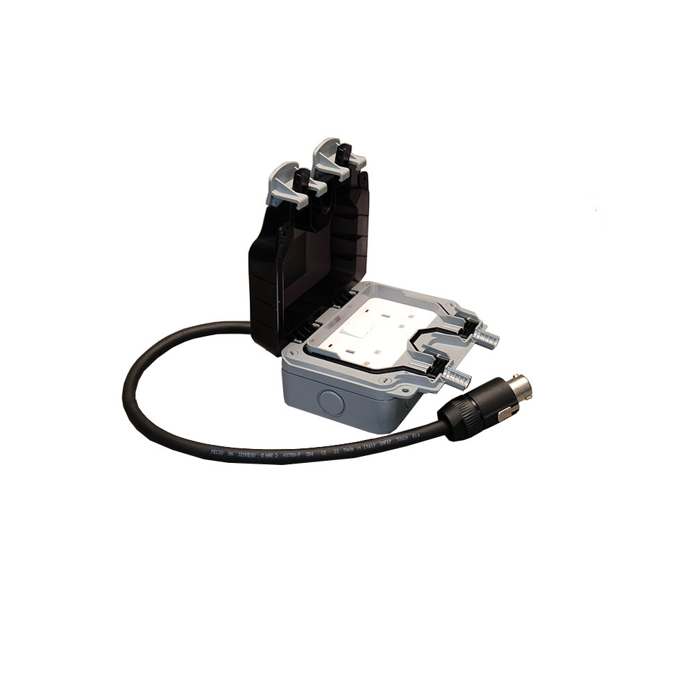 PowerCON 32Amp to Dual 13Amp Socket 1.5M (WP). (NXTGENBPS-PN-32A-13A-WP-SOCKET). Quality connectors. Suitable for use with Meerkat, Fox and Goat batteries.